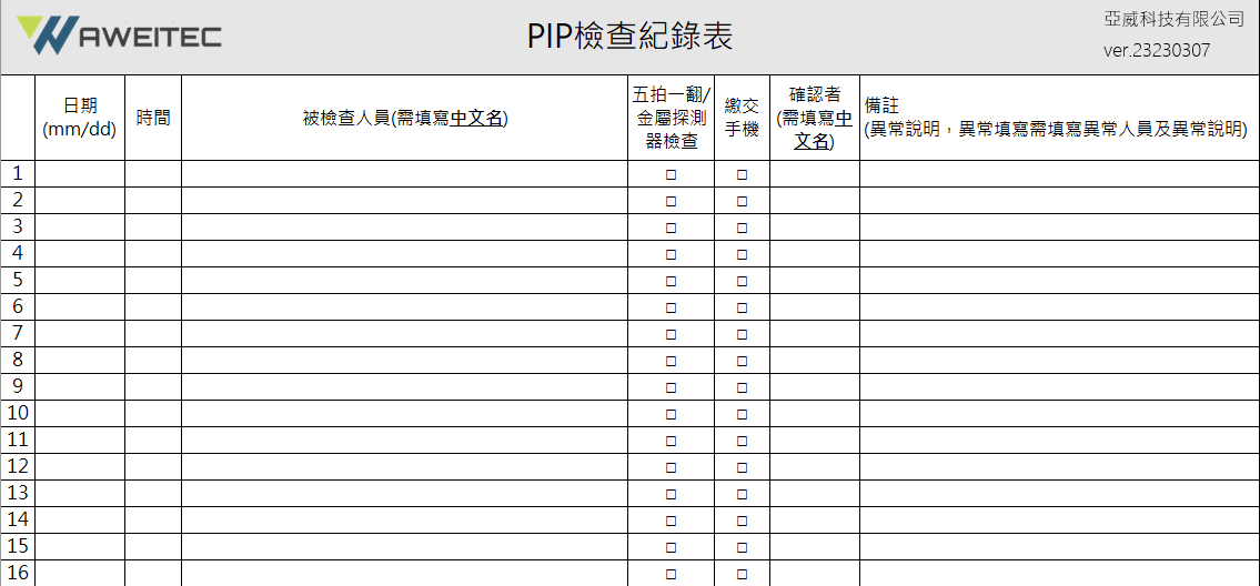 28 3 月 【公司動態】落實進廠前PIP規範 Posted at 14:20h in 公司動態 by awei PIP規範 新進員工須完成PIP教育訓練課程及持續PIP宣導,加深員工PIP觀念。 為強化亞威員工之PIP管理及避免PIP違規之情事發生,我司針對進出廠PIP執行規範。 作法如下: 進場前到辦公室集合 人員進場前一律須要辦公室集合 手機鎖於個人手機櫃 人員須在確認者面前將手機鎖於櫃中 五拍一翻 人員須與確認者面對面執行,確認者須檢查人員每一個口袋/無塵包 金屬探測棒 再次確認有無攜帶違禁品 PIP 管制表 人員與確認者皆需簽名 簡訊回報 確認者檢查完成無異,需簡訊回傳給客戶/工安Leader回報